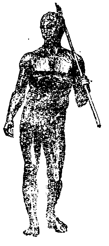 这些作品中的著名代表作是《持矛者像》,表现一个手持矛的运动员迈着坚定步伐进入运动场的情景。原作为青铜,现存者只有大理石的仿制品。从其中我们可以看到波吕克列伊托斯雕刻“法式”的一些规则:人像的头部和身长的比例接近1:7,即艺术家理解为健壮的成年人的典型比例。全像的重量,也就是人物的体重,只由一支脚承担,另一支脚自由舒展。例如,《持矛者像》的右脚承担体重,左脚则不负任何重力,膝部弯曲而仅以脚趾触地。既然脚的承重左右判然有别,身体各部位的紧张松弛也要随之产生交互影响而呈对应的变化。例如《持矛者像》的用力的右脚和持矛的左手相呼应,松弛的左脚和自由的右手相对照,左肩负矛应抬高一点,右肩则较低,头也略微向右侧,如此等等。由此可见,波吕克列伊托斯的“法式”是巧妙地处理了人体各部位在运动中的辩证统一关系,从而使雕像显得生动灵活,优雅自然。与此同时,波吕克列伊托斯也像菲狄亚斯那样,着意于塑造接近于理想的完美境界的典型形象。他的雕像不是个别运动员的直接模写,而是具有完美体形的理想人物,从而使雕像的思想内容丰富得多。他既可被看作是一个拿着矛进入运动场的体育家,也可被看作是一个满怀信心走向战场的战士。这反映了古典艺术所共有的时代特色。