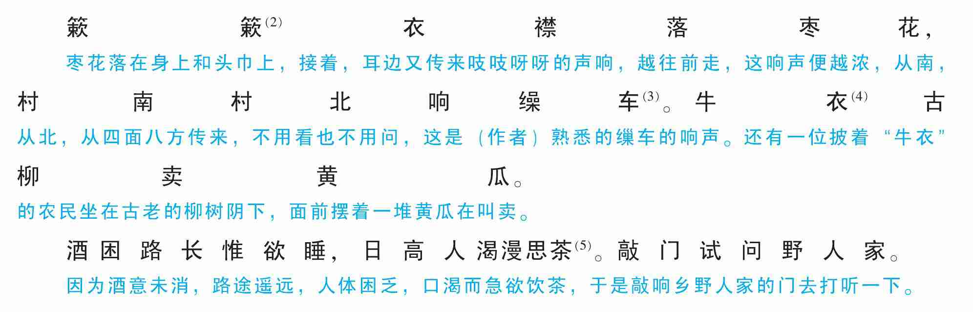 簌簌(2)衣襟落枣花,村南村北响缲车(3)。牛衣(4)古柳卖黄瓜。