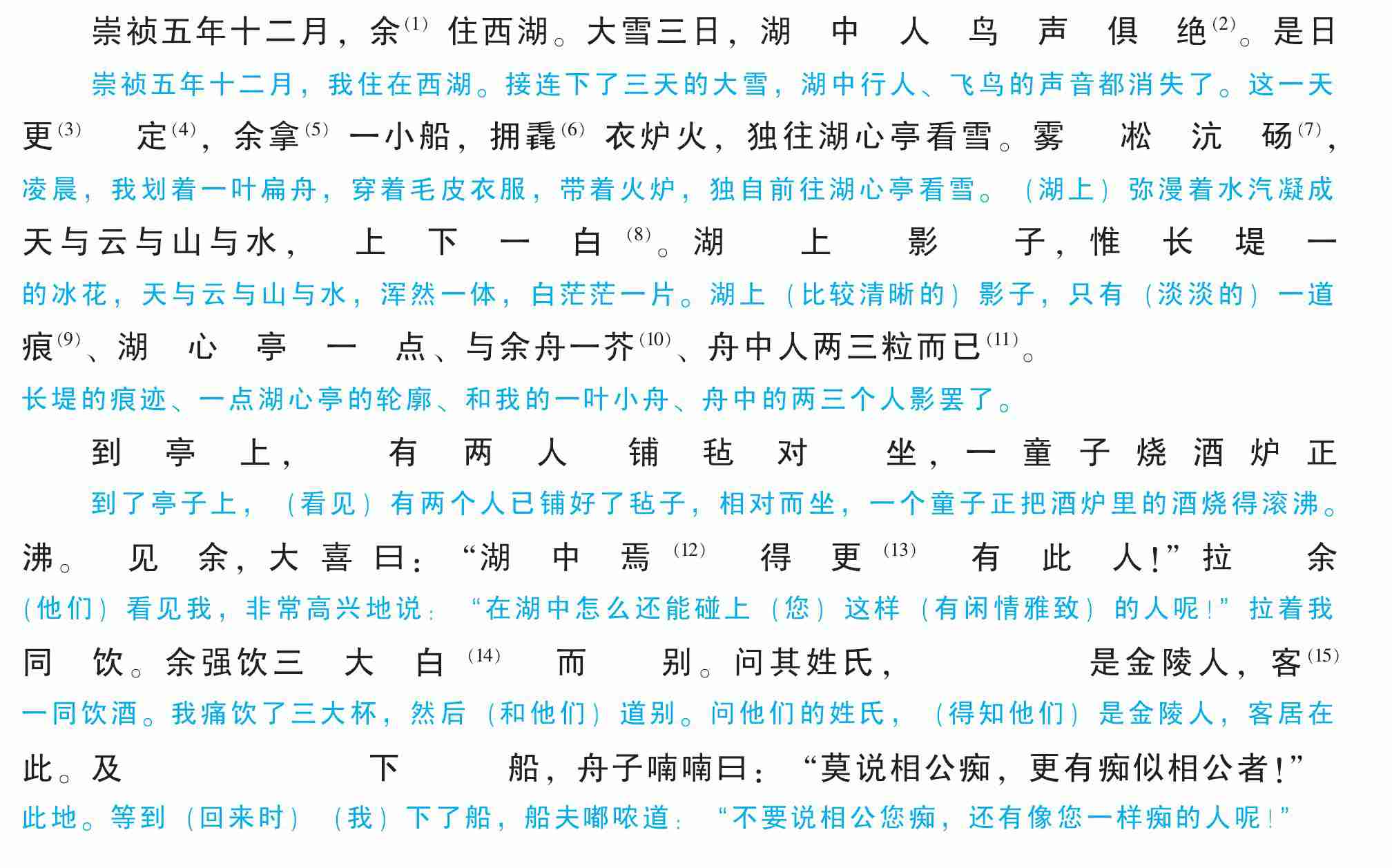 到亭上,有两人铺毡对坐,一童子烧酒炉正沸。见余,大喜曰:“湖中焉(12)得更(13)有此人!”拉余同饮。余强饮三大白(14)而别。问其姓氏,是金陵人,客(15)此。及下船,舟子喃喃曰:“莫说相公痴,更有痴似相公者!