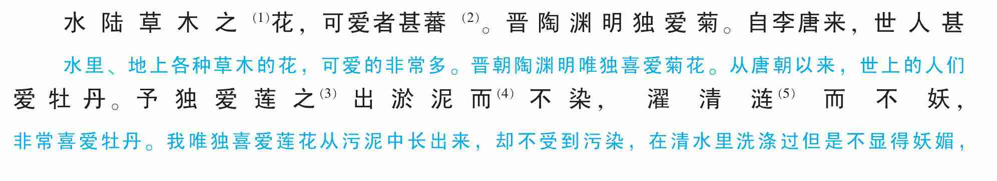 水陆草木之花,可爱者甚蕃(2)。晋陶渊明独爱菊。自李唐来,世人甚爱牡丹。予独爱莲之(3)出淤泥而(4)不染,濯清涟(5)而不妖,中通(6)外直,不蔓不枝(7),香远益清,亭亭净植(8),可远观而不可亵玩(9)焉。