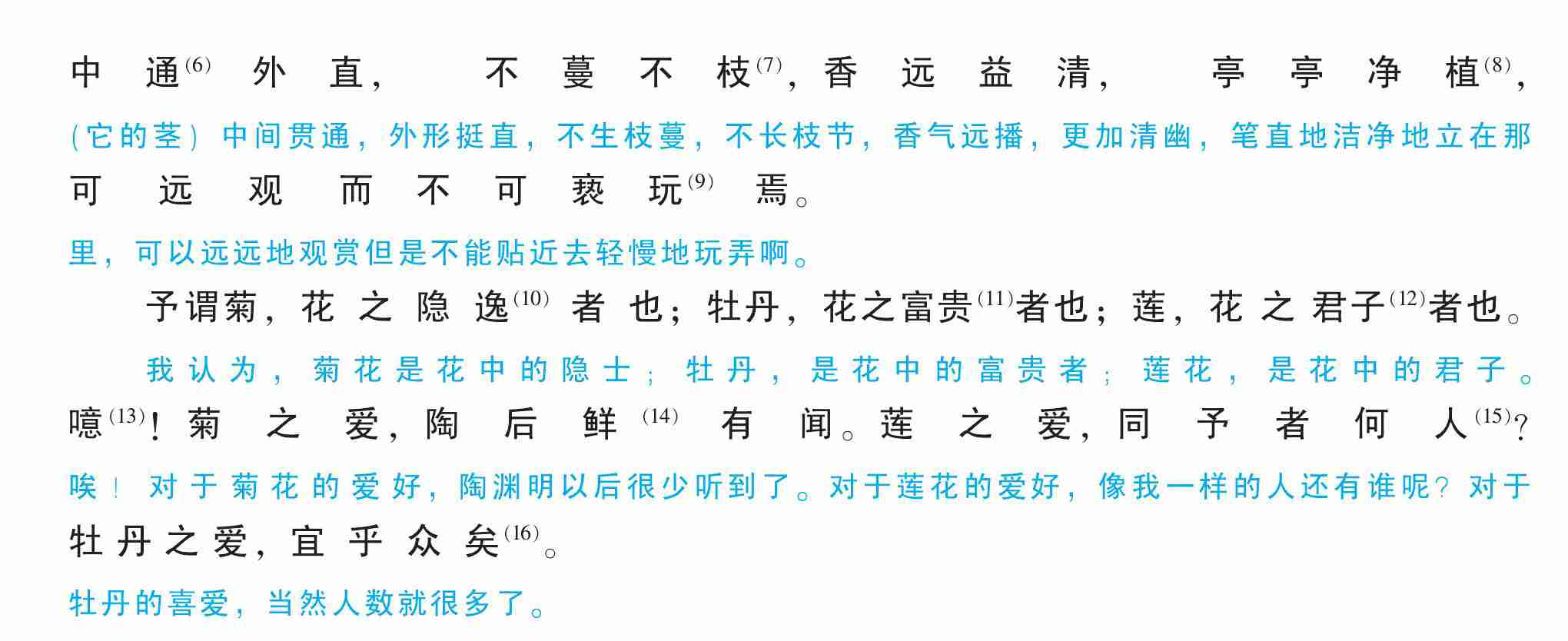 予谓菊,花之隐逸(10)者也;牡丹,花之富贵(11)者也;莲,花之君子(12)者也。噫(13)!菊之爱,陶后鲜(14)有闻。莲之爱,同予者何人(15)?牡丹之爱,宜乎众矣(16)。