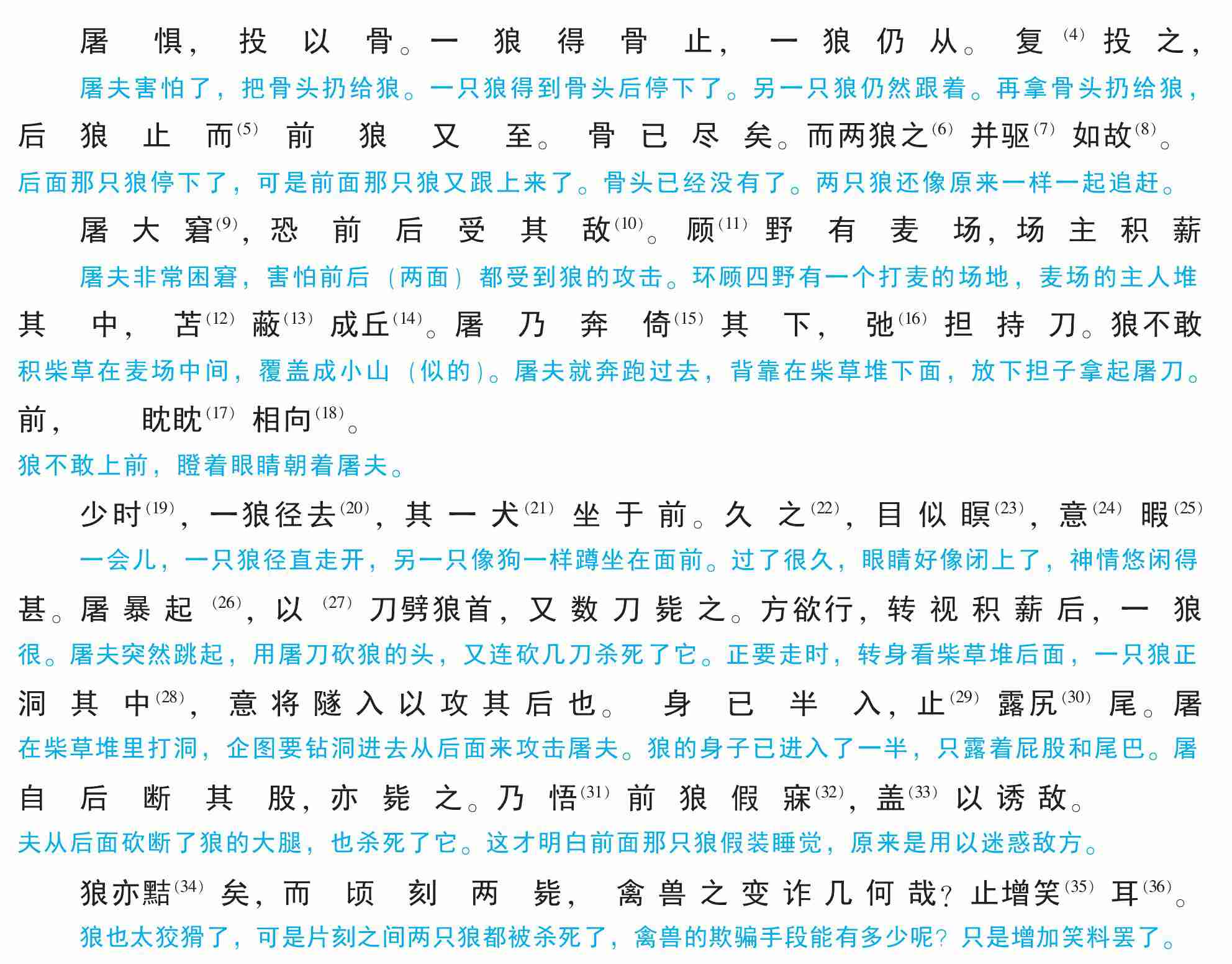 少时(19),一狼径去(20),其一犬(21)坐于前。久之(22),目似瞑(23),意(24)暇(25)甚。屠暴起(26),以(27)刀劈狼首,又数刀毙之。方欲行,转视积薪后,一狼洞其中(28),意将隧入以攻其后也。身已半入,止(29)露尻(30)尾。屠自后断其股,亦毙之。乃悟(31)前狼假寐(32),盖(33)以诱敌。