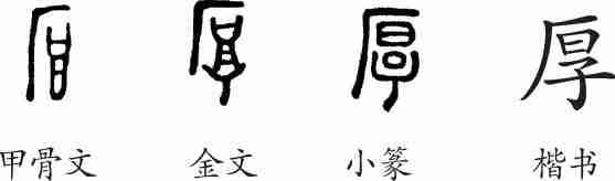 “厚”为形声字。甲骨文上部为“厂”,像山崖;下部为“”,像一个敞口尖底的酒坛,从厂从会意,也兼表声。金文下部更像一个尖底的酒坛形。小篆整齐化,线条化。隶变后楷书写作“厚”。