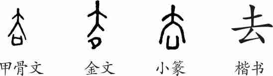 “去”是会意字。甲骨文从人、从口,会人离开了门口而去之意。金文大致相同。小篆承接甲骨文、金文。隶变后楷书写作“去”。