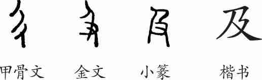 “及”是会意字。甲骨文像一手从后面抓住一个人的样子。金文像一个弯腰的人被背后伸过来的一只右手捉住了腿。小篆承接金文而来。隶变后楷书写作“及”。