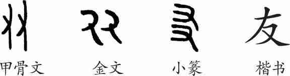“友”是会意字。甲骨文和金文都是方向相同的两只右手靠在一起的样子,会志同道合地做一件事情之意。隶变后楷书写作“友”。