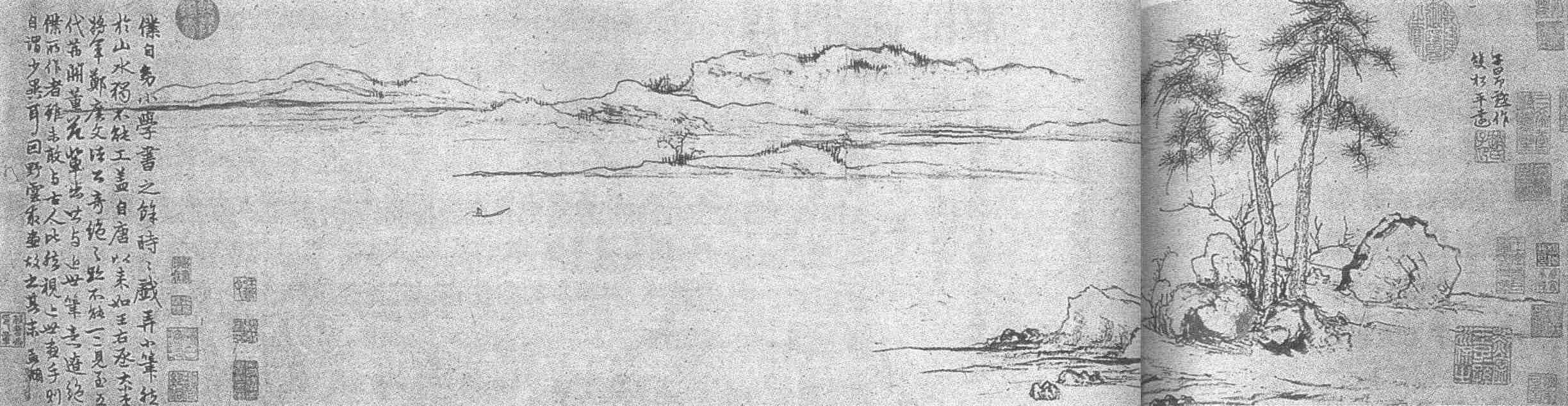这幅墨笔山水无年款,右上角自题“子昂戏作双松平远”,是画题出处。卷尾有题字:“仆自幼小学书之余,时时戏弄小笔,然于山水独不能工。盖自唐以来,如王右丞、大小李将军、郑广文诸公奇绝之迹,不能一二见。至五代荆、关、董、范辈出,皆与近世笔意辽绝。仆所作者虽未敢与古人比,然视近世画手,则自谓少异耳。因野云求画,故书其末。孟頫。”这段简短的题字表露了作者的旨趣、对师承的向往,及与“近世”(指南宋)画派在审美理想上的差异。