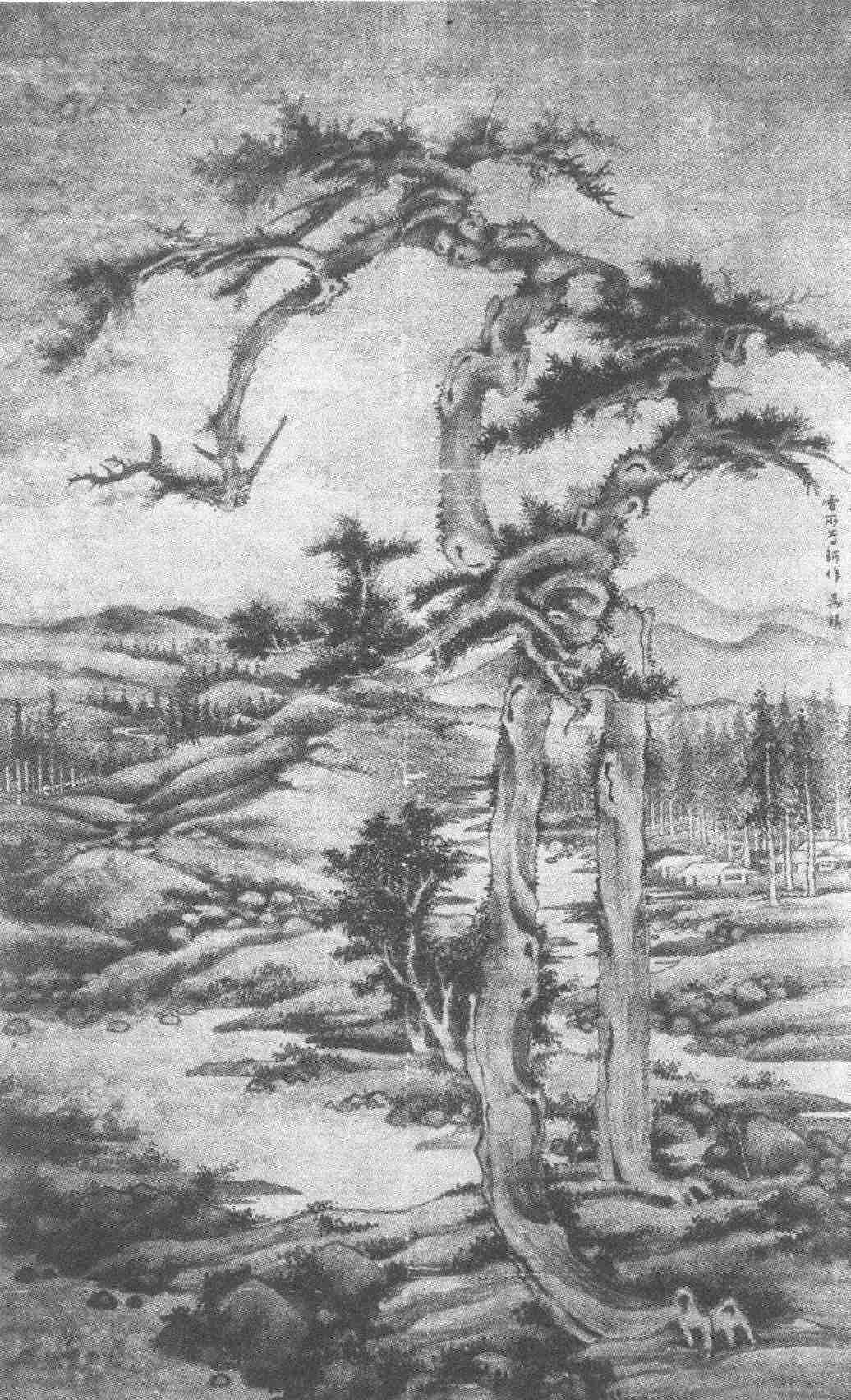 此图取材于浙西一带山景水乡,山是秀丽的低峦平冈,树是丰茂的杂木丛林,地是满布湖泊溪涧略起丘陵的平原,充满着旖旎的江南风光。两枝老桧,顶天立地,兀立溪畔,图幅右边稍远处有一村落,在密茂的树丛中,屋舍俨然,屋外围以篱栅,屋侧临水,屋后有径路远去。图左方平冈迤逦,水流盘曲,遥望万木森森,葱翠不尽,远处渍出远山,这是几十里之外的地方了。作者把两枝桧树耸得高,地平线拉得低,益发显得冈峦层层,水流曲曲,逗人极目远眺,欣然意远。