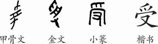 “受”是会意兼形声字。甲骨文上下为两只手,中间是一条船,是一手“授”、一手“受”的意思,会一方给予、一方接受之意。金文中间部分讹为“舟”,舟兼表声。小篆线条化。隶变后楷书写作“受”。