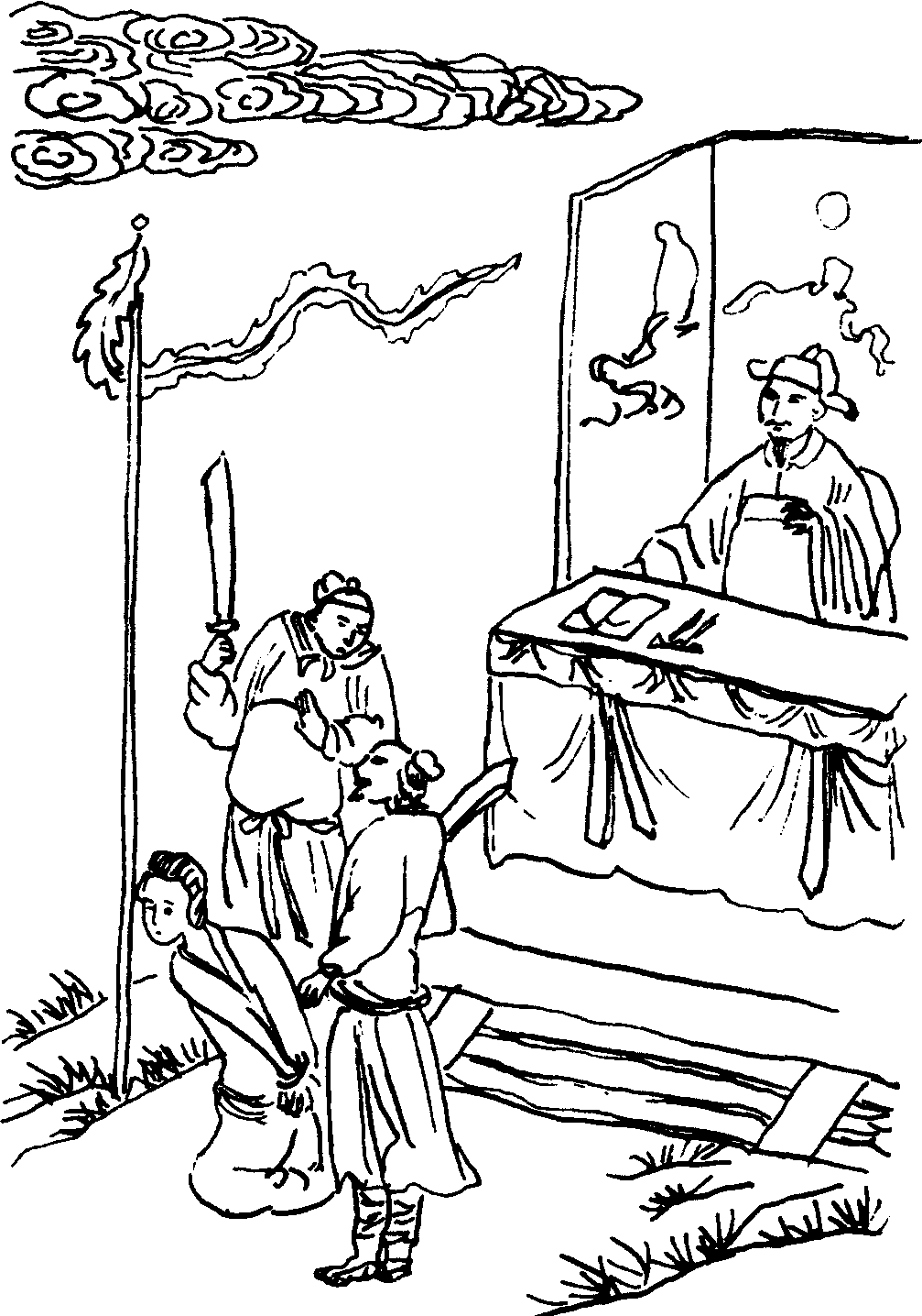 (刽子做磨旗科,云)怎么这一会儿天色阴了也? (内做风科,刽子云)好冷风也! (正旦唱)