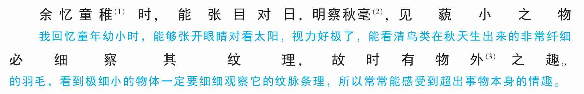 余忆童稚时,能张目对日,明察秋毫(2),见藐小之物必细察其纹理,故时有物外(3)之趣。