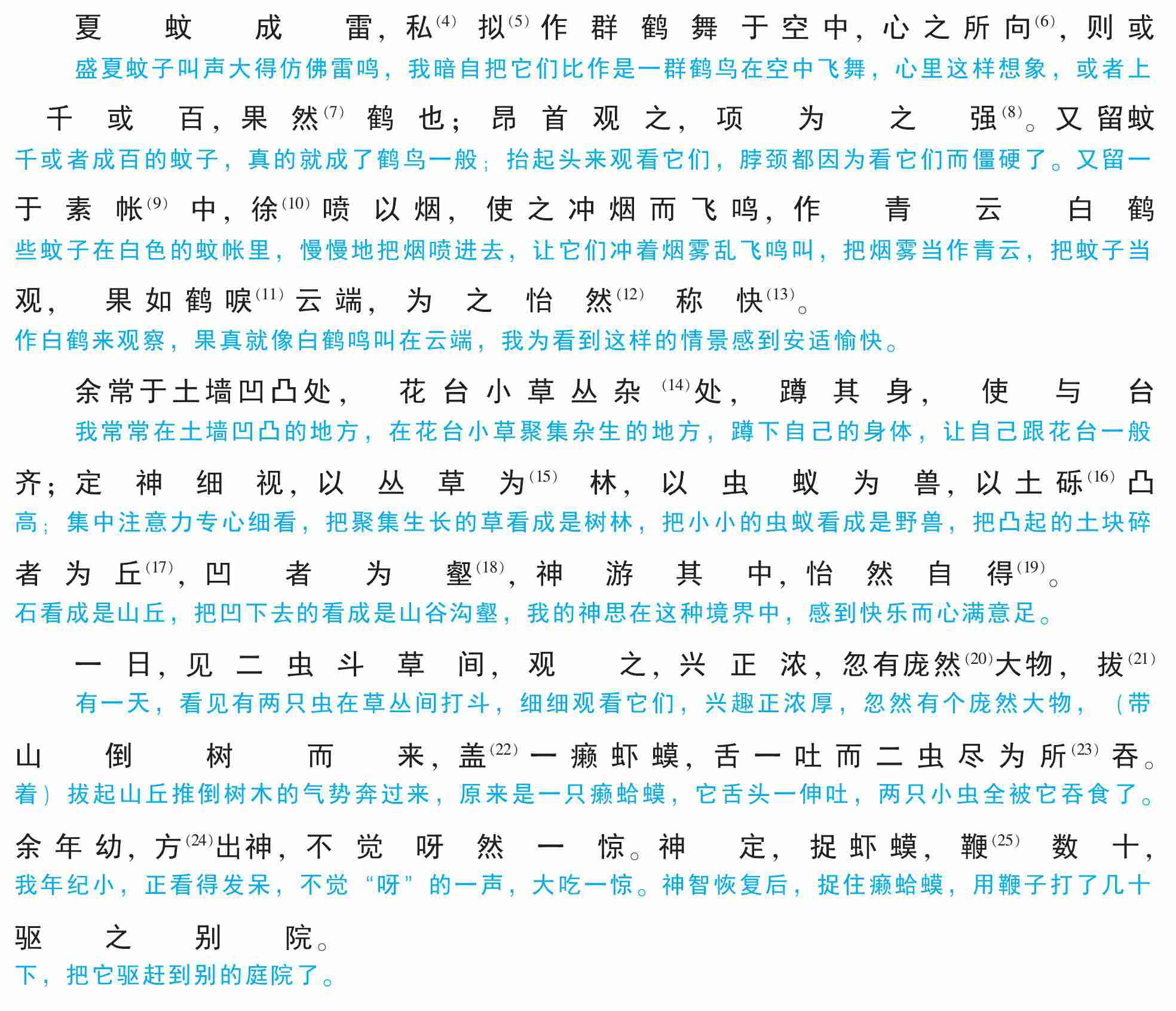 夏蚊成雷,私(4)拟(5)作群鹤舞于空中,心之所向(6),则或千或百,果然(7)鹤也;昂首观之,项为之强(8)。又留蚊于素帐(9)中,徐(10)喷以烟,使之冲烟而飞鸣,作青云白鹤观,果如鹤唳(11)云端,为之怡然(12)称快(13)。