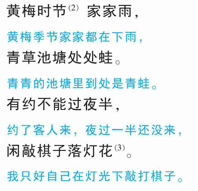 (1)选自 《清苑斋集》。 赵师秀 (1170—1219), 字紫芝、 灵芝, 号灵秀 、 天乐 。 永嘉 (现在浙江温州 ) 人 。南宋诗人。 (2) 〔黄梅时节〕 夏初江南梅子黄熟的时节。 (3) 〔灯花〕 点油灯时灯芯结出的疙瘩。