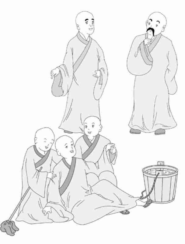 乙寺庙的方丈没有过多解释,而是将甲寺庙的方丈带到了寺院中。这时一个小和尚正巧挑水回来,一不小心跌倒在了地上,这时正在拖地的小和尚跑了过来将他扶了起来,连忙抱歉地说:“对不起,都是我的错,是我将地拖得太湿了。”这时在门口的小和尚也跑了过来:“对不起,这都是我的错,是我忘了告诉你正在拖院子,才害你跌倒的。”此时摔倒的小和尚笑笑说:“其实这都是我自己的错,是我太粗心了,还将水洒在了地上,害你得重新拖一遍。”最后三人决定一起将地重新拖一遍。