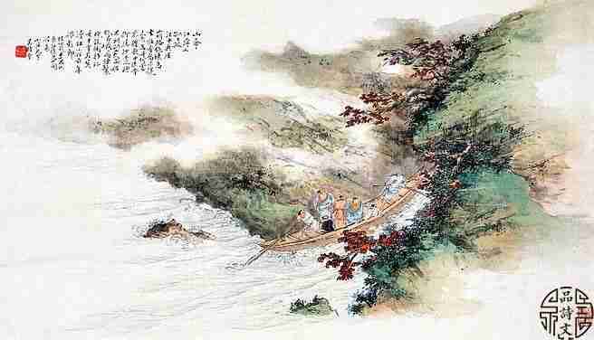 李思训是我国“北宗”山水画的创始人,他是唐朝的宗室,开元间官至右武卫大将军,新、旧《唐书》均有传。他的山水画被称为“李将军山水”。他曾在江都(今属江苏扬州)、益州(州治在今四川成都)做过官,宦程所经,长江风景是他亲身观赏过的,此画即使不是对景写生,画中景色也是经过画家灵敏的眼光取得了印象的,和向壁虚构和对前人山水的临摹不同。诗中所叙的“大孤小孤”,大孤山在今江西九江市东南波阳湖中,四面洪涛,孤峰挺峙;小孤山在今江西彭泽县北、安徽宿松县东南的大江中,屹立中流。两山遥遥相对。“崖崩”两句,极写山势险峻,乔木苍然,是为画面最惹眼的中心。“客舟”以下四句,写画中小船,直如诗人身在画境之中,忽闻棹歌,不觉船之骤至。更进一步,诗人俨然进入了小舟之中,亲自体会着船在江上低昂浮泛之势。诗人曾有《出颍口初见淮山,是日至寿州》一律,其颔联“长淮忽迷天远近,青山久与船低昂”,和第七句“波平风软望不到”,与这首诗的“沙平”两句,上下只改动了两个字,可见这两句是他舟行时亲身体会而获的得意之句,不觉重又用于这首题画诗上。至此,画面上所见的已完全写毕,照一般题画诗的惯例,应该是发表点评价,或对画上的景物发点感叹了,但苏轼却异军突起地用了一个特别的结束法,引入了有关画中风景的当地民间故事,使诗篇更加余音袅袅。