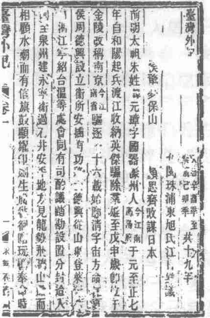 清代白话长篇历史演义小说。一名《台湾外纪》,又名《台湾外志》、《赐国姓郑成功全传》。三十卷。题“九闽珠浦东旭氏江日升识”。江日升,字东旭,福建珠浦人,生平不详。成书于清康熙四十三年(1704)。