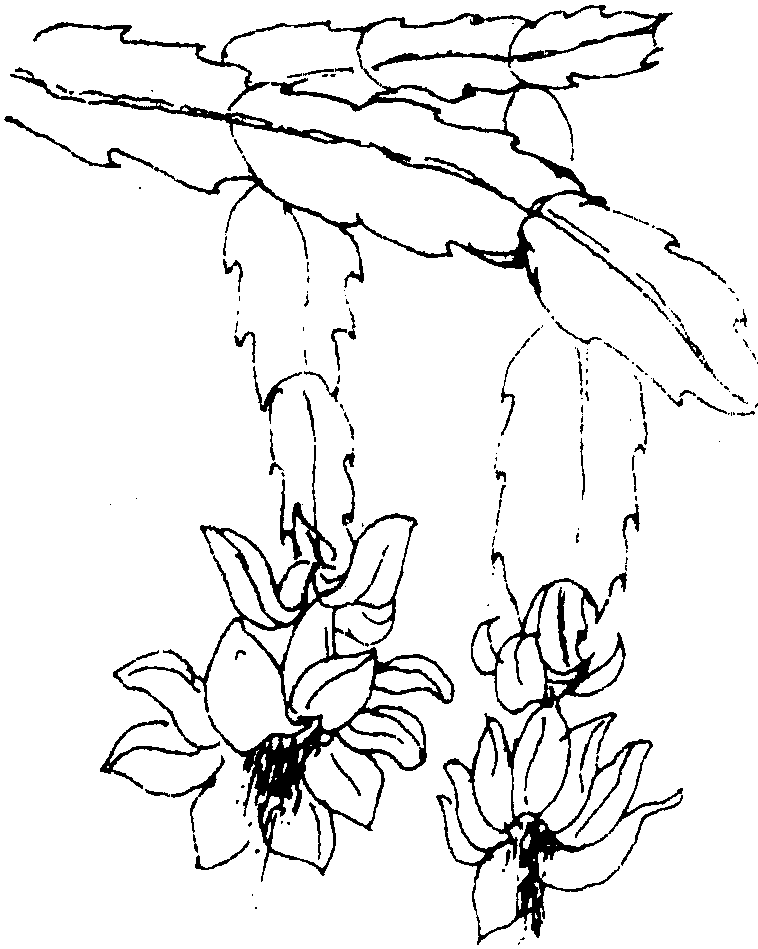 蟹爪兰是仙人掌科蟹爪兰属多浆植物,株高30~50厘米,外形与仙人指相似。蟹爪兰的茎节比仙人指的茎节稍长一些,长约7厘米,茎节扁平,边缘有2~4对尖齿。茎节多分枝,在绿色茎节的顶端,吐出紫红色小花苞,长大开红花,花瓣反卷,像倒挂金钟,累累下垂,花中心是花蕊。此花春节前后开放,十分可爱。浆果,卵形,红色。