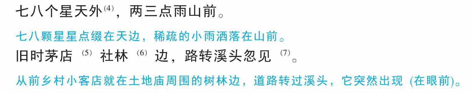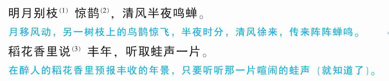 (1)〔别枝〕另一树枝。(2)〔惊鹊〕使乌鹊受惊。惊,使动用法,使……受惊。(3)〔说〕述说,这里有预报的意思。(4)〔天外〕天边。(5)〔茅店〕乡村小客店。(6)〔社林〕土地庙旁边的树林。(7)〔见〕通“现”,显现、出现。