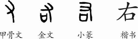 “右”是会意字。甲骨文字形像一个人手捧祭品于祭台前,会求神保佑之意。金文、小篆都直接由甲骨文演化而来。隶变后楷书写作“右”。