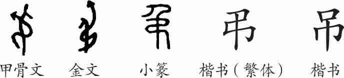 “吊”是会意字。是“弔”的俗字。甲骨文字形像人手拿带绳子的箭,会射猎之意。隶变后楷书写作“弔”和“吊”。如今规范化,以“吊”为正体。