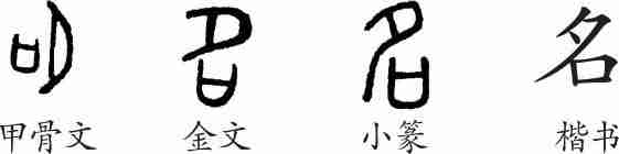 “名”为会意字。甲骨文从口,从夕。金文变成上下结构,但其义未变。小篆整齐化。隶变后楷书写作“名”。