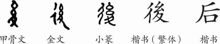 “后”是会意字。甲骨文从女,从倒向的“子”。金文承接甲骨文。小篆整齐化。隶变后楷书写作“后”。