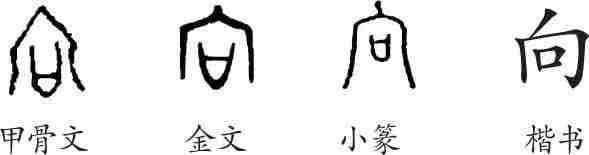 “向”是象形字。甲骨文像屋墙上有窗户之形。金文和小篆承接甲骨文,变化不大。隶变后楷书写作“向”。
