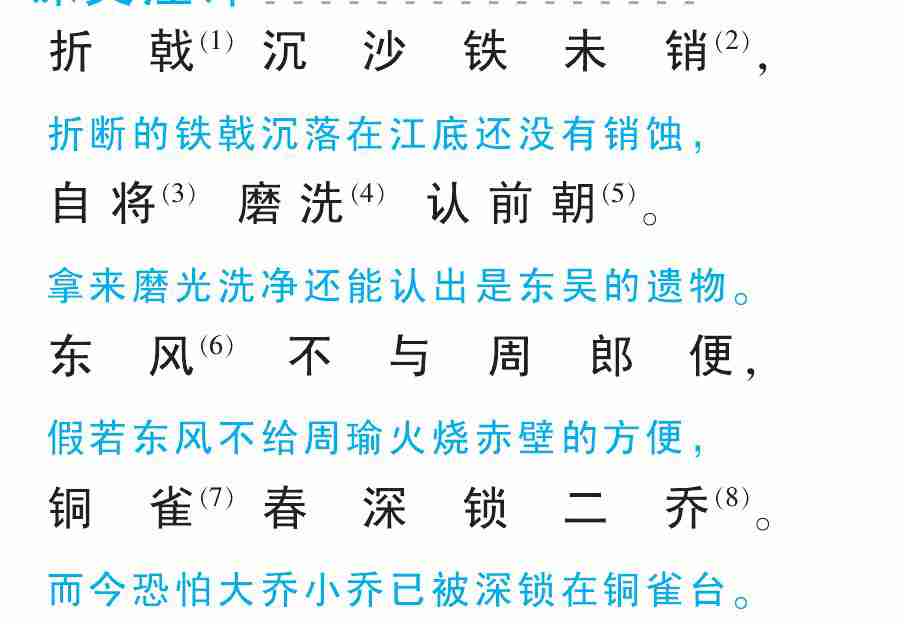 (1) 〔 折戟 〕 折断的戟 。 戟 , 古代兵器 。 (2) 〔 销 〕 销蚀 。 (3) 〔 将 〕 拿起 。 (4) 〔 磨洗 〕 磨光洗净 。(5)〔认前朝〕 认出戟是东吴破曹时的遗物。 (6) 〔东风 〕 指火烧赤壁事 。 (7) 〔铜雀 〕 台名 , 曹操所建 , 是曹操暮年行乐处。 故址现在河北临漳。 (8) 〔二乔〕 指江东乔公的女儿, 都是东吴的美女, 大乔是孙策 (孙权兄) 的妻子, 小乔是周瑜的妻子。