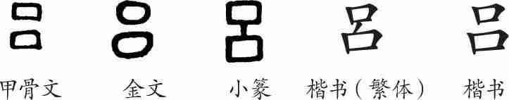 “吕”是象形字。甲骨文是两个方“口”,像是人(或动物)的脊骨连成一串。金文则变成了长圆形。隶变后楷书写作“呂”。汉字简化后写作“吕”。