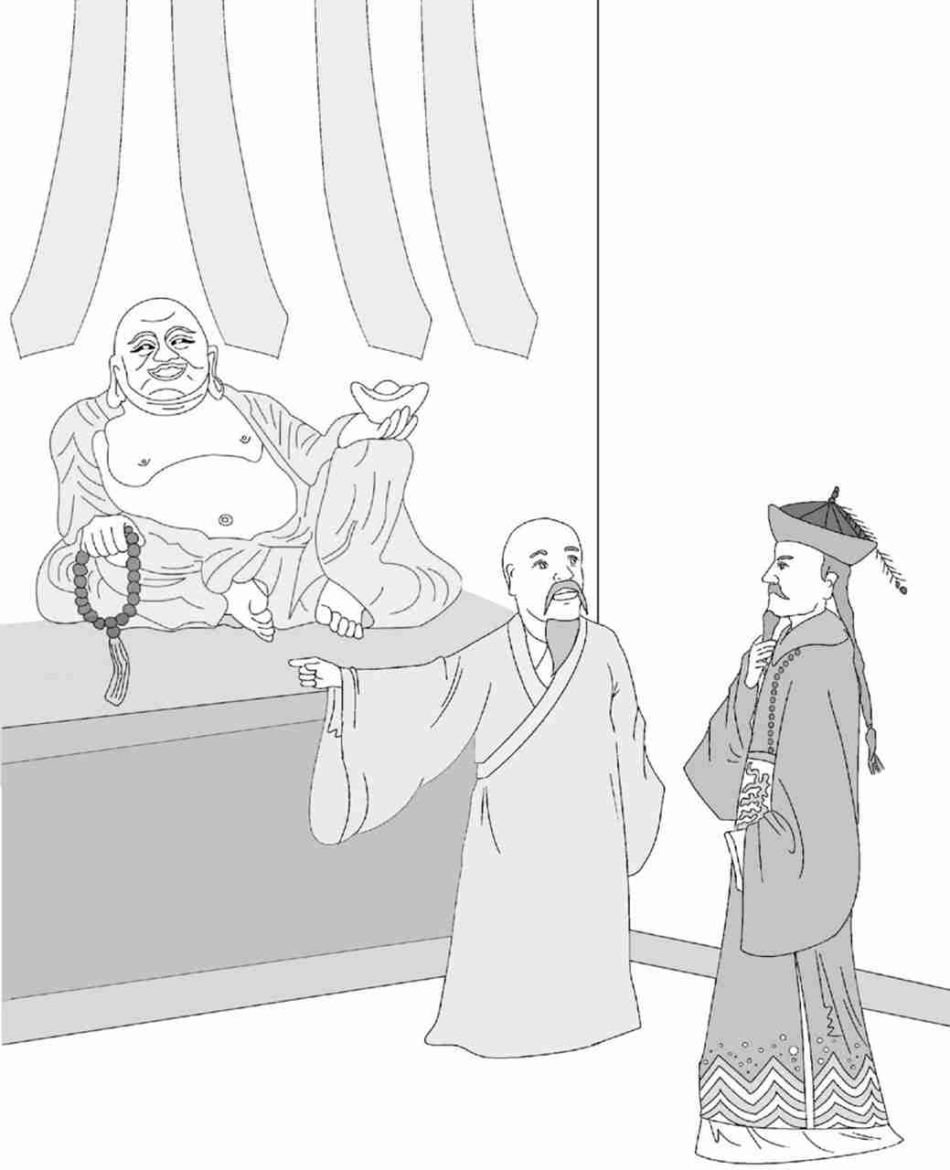 当他们走进大殿,正好看到弥勒佛,于是乾隆问道:“这尊弥勒佛为何笑呀?”园智答道:“他在笑小僧终日青灯木鱼,整日碌碌无为。”乾隆一听,这下可找到你的错处了,于是说道:“他难道也在笑朕整日碌碌无为吗?”园智不慌不忙地答道:“当然不是了,佛祖对不同人,笑的含义也是不同的。他对您笑,是在笑迎圣上,笑您整日为国事操劳,不像我们凡夫俗子,肚量小,只会笑里藏刀。”乾隆一听这话中有话,明明在说自己肚量小,但又不好明说,只好忍下去了。