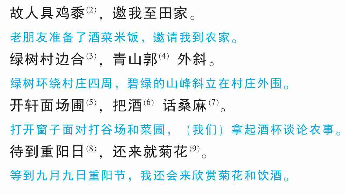 (1)选自 《孟襄阳集》。 孟浩然 (689—740), 襄阳人, 唐代诗人。 故人庄, 老朋友的田庄。 (2) 〔黍 (shǔ)〕黄米饭。 (3) 〔合〕 环绕。 (4) 〔郭〕 这里指村庄的外围。 (5) 〔场圃〕 打谷场和菜圃。 (6) 〔把酒〕 拿起酒杯。(7) 〔桑麻〕 这里指庄稼。 (8) 〔重阳日〕 九月九日重阳节。 (9) 〔就菊花〕 指欣赏菊花。