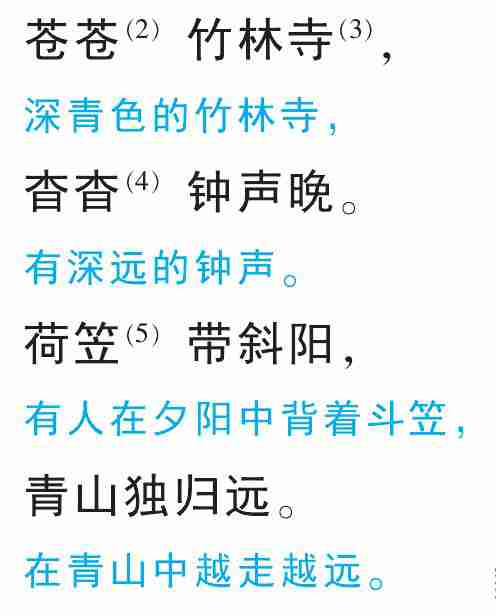 (1)选自 《刘随州诗集》 卷。 灵澈上人, 唐代著名僧人, 本姓杨, 会稽 (现在浙江绍兴) 人, 后为云门寺僧。上人, 对僧的敬称。 刘长卿, 字文房, 唐代诗人。 (2)〔苍苍〕 深青色。 (3)〔竹林寺〕 在现在江苏丹徒南。 (4)〔杳杳 (yǎoyǎo)〕 深远的样子。 (5)〔荷 (hè) 笠〕 背着斗笠。 荷, 背着。