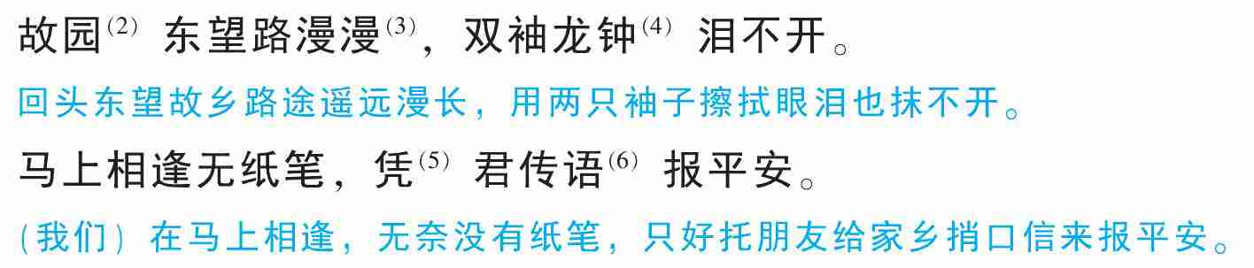 故园(2)东望路漫漫(3), 双袖龙钟(4)泪不开。