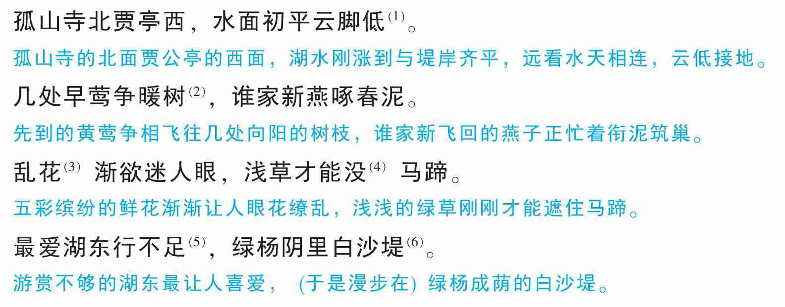 (1)〔云脚低〕白云重重叠叠,同湖面上的波澜连成一片,看上去,浮云很低,所以说“云脚低”。(2)〔暖树〕向阳的树。(3)〔乱花〕色彩缤纷争相开放的鲜花。(4)〔没〕遮住。(5)〔不足〕不够。(6)〔白沙堤〕指西湖的白堤,又称沙堤或断桥堤。