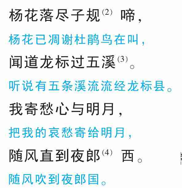 (1)选自 《李太白全集》。 龙标, 唐朝县名 (现在湖南黔阳)。 王昌龄这次是被贬为龙标尉。 (2) 〔子规〕 即杜鹃鸟。 (3) 〔五溪〕 湖南西部五条溪流的总称。 (4) 〔夜郎〕 古代少数民族国名, 辖境主要在现在贵州西部。这里指唐代夜郎县, 在今湖南阮陵县。