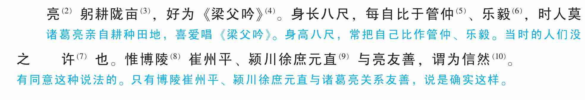 亮(2)躬耕陇亩(3),好为《梁父吟》(4)。身长八尺,每自比于管仲(5)、乐毅(6),时人莫之许(7)也。惟博陵(8)崔州平、颍川徐庶元直(9)与亮友善,谓为信然(10)。