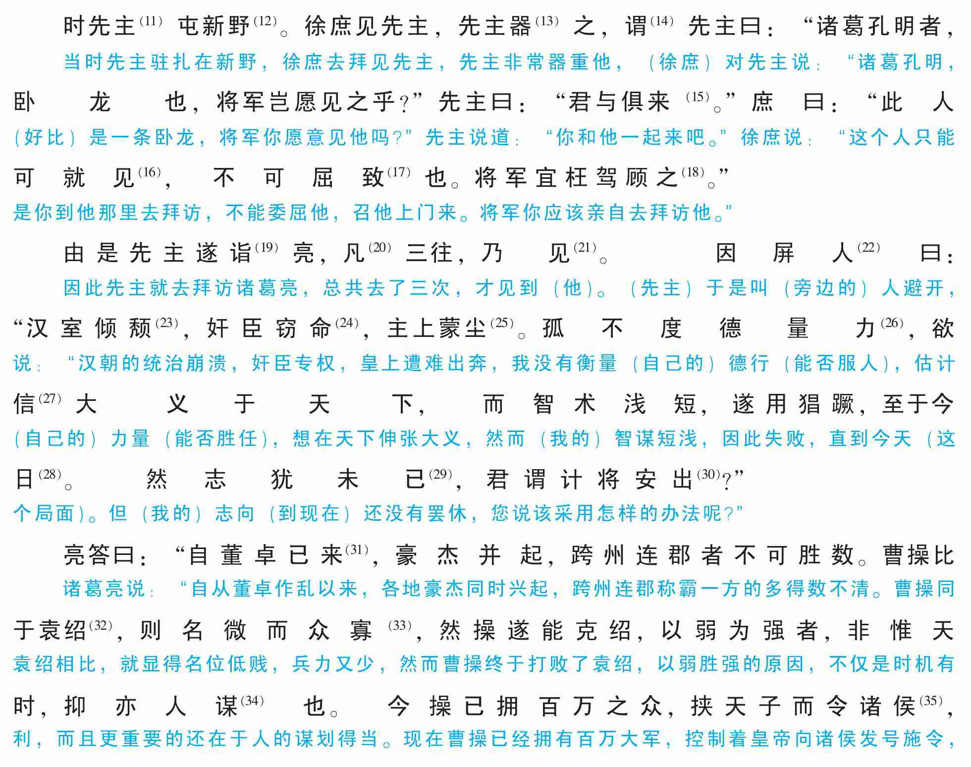 由是先主遂诣(19)亮,凡(20)三往,乃见(21)。因屏人(22)曰:信(27)大义于天下,而智术浅短,遂用猖蹶,至于今日(28)。然志犹未已(29),君谓计将安出(30)?”