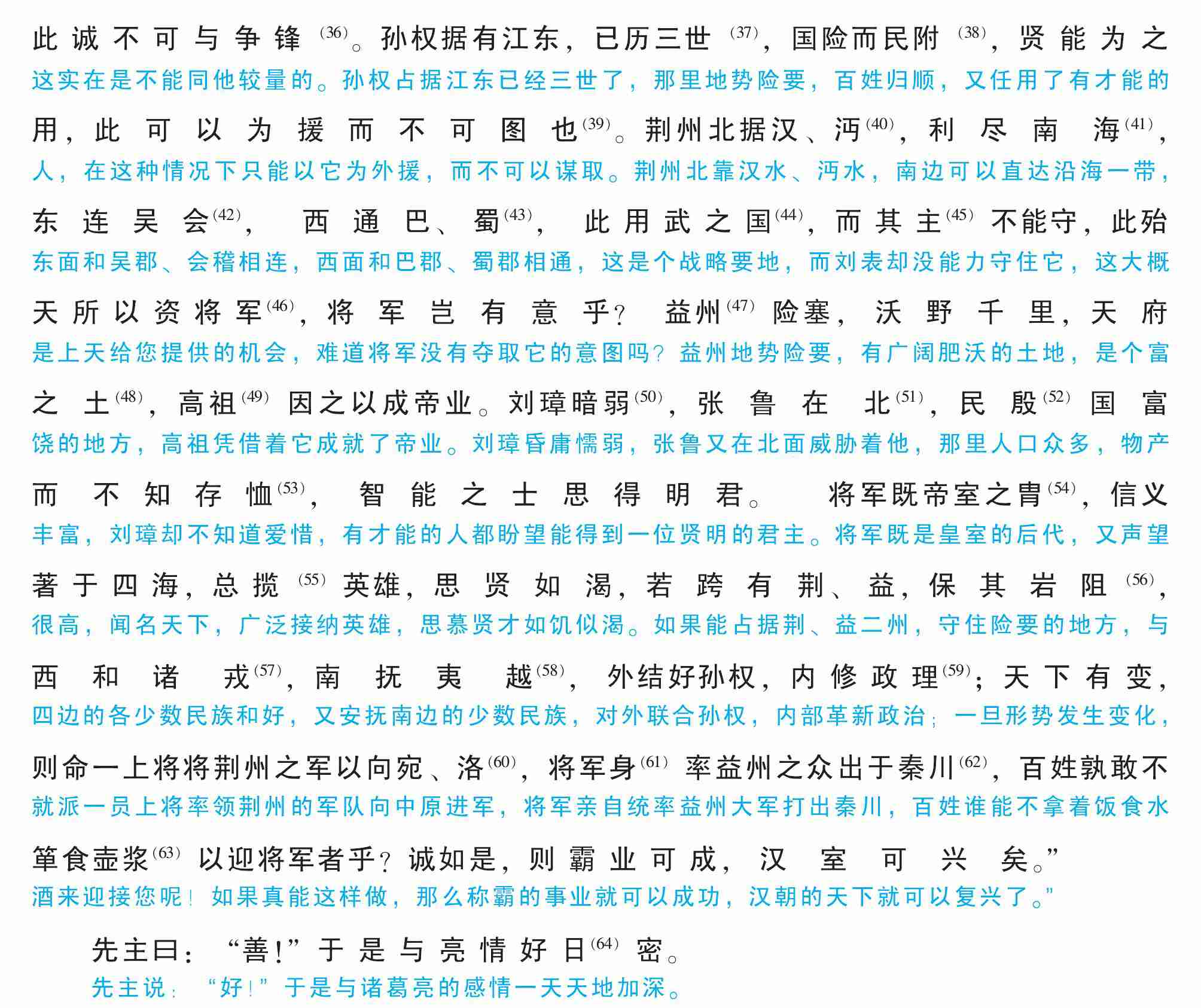 此诚不可与争锋(36)。孙权据有江东,已历三世(37),国险而民附(38),贤能为之用,此可以为援而不可图也(39)。荆州北据汉、沔(40),利尽南海(41),东连吴会(42),西通巴、蜀(43),此用武之国(44),而其主(45)不能守,此殆天所以资将军(46),将军岂有意乎?益州(47)险塞,沃野千里,天府之土(48),高祖(49)因之以成帝业。刘璋暗弱(50),张鲁在北(51),民殷(52)国富而不知存恤(53),智能之士思得明君。将军既帝室之胄(54),信义著于四海,总揽(55)英雄,思贤如渴,若跨有荆、益,保其岩阻(56),西和诸戎(57),南抚夷越(58),外结好孙权,内修政理(59);天下有变,则命一上将将荆州之军以向宛、洛(60),将军身(61)率益州之众出于秦川(62),百姓孰敢不箪食壶浆(63)以迎将军者乎?诚如是,则霸业可成,汉室可兴矣。”