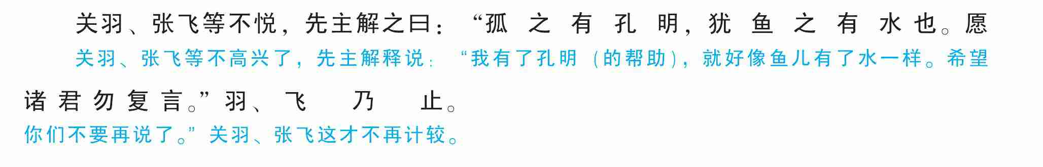 关羽、张飞等不悦,先主解之曰:“孤之有孔明,犹鱼之有水也。愿诸君勿复言。”羽、飞乃止。