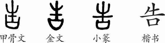 “告”是会意字。甲骨文从口,从牛,会用牛羊祭祀祷告神灵求福之意。金文大致相同,小篆整齐化。隶变后楷书写作“告”。