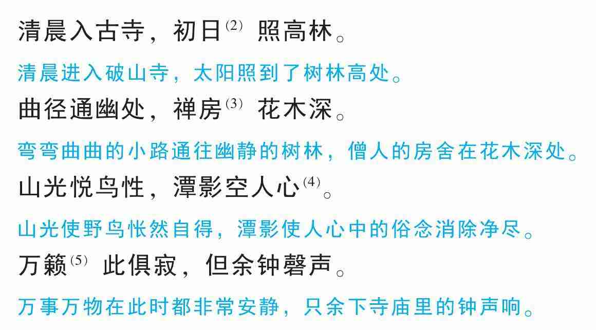(1)选自 《全唐诗》。 常建, 生卒年不详。 大约是长安 (现陕西西安) 人。 唐代诗人。 破山寺, 现在江苏常熟虞山北。 (2) 〔初日〕 早上的太阳。 (3) 〔禅房〕 僧人的房舍。 (4) 〔人心〕 指人的尘世之心。 (5) 〔万籁〕 指大自然的各种声音。