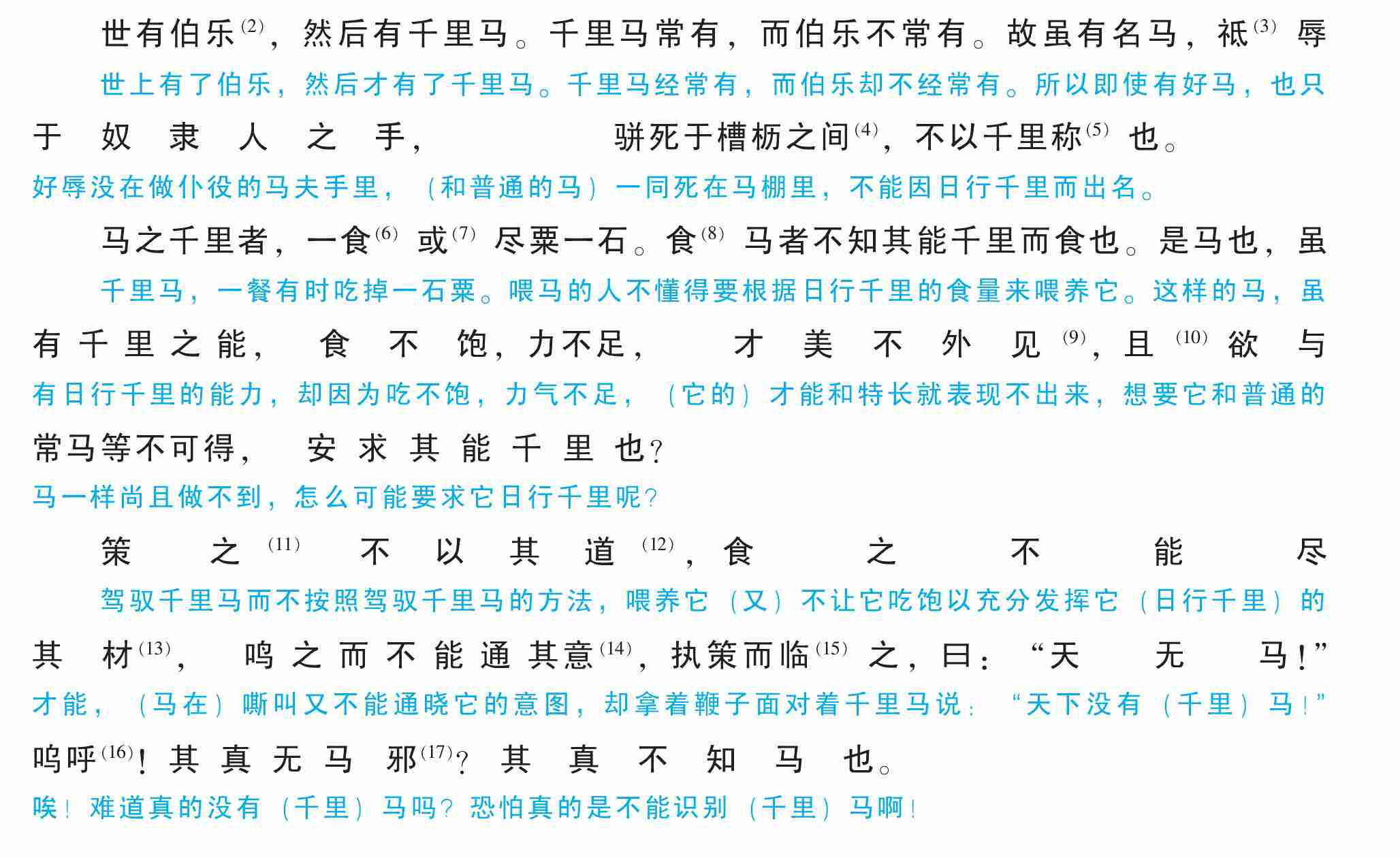 (1) 选自 《 韩愈文选 》 ( 人民文学出版社 1980 版 ) 中的 《 杂说 》 。 《 杂说 》 共四篇 , 《 马说 》 是第四篇 。(2)〔伯乐〕 本名孙阳, 春秋时人, 擅长相马。 (3) 〔祗〕 只是。 (4) 〔骈(pián)死于槽枥(lì)之间〕 (和普通的马)一同死在槽枥之间。 骈, 两马并驾。 骈死, 并列而死。 槽枥, 喂牲口用的槽。 (5) 〔不以千里称〕 意思是不以千里马著称, 即人们并不认识这是千里马。 (6) 〔一食〕 吃一顿。 (7) 〔或〕 有时。 (8) 〔食 (sì)〕 通 “饲”, 喂。下文 “而食” “食之” 的 “食”, 都念sì。 (9) 〔外见〕 表现在外面。 见, 通 “现”。 (10) 〔且〕 犹, 尚且。(11) 〔策之〕 鞭打马。 策, 马鞭子, 这里是用鞭子打的意思 。 (12) 〔以其道 〕 按照 (驱使千里马的 ) 正确方法 。道, 正确的方法。 (13) 〔尽其材〕 竭尽它的才能, 指喂饱马, 使它日行千里的能力充分发挥出来。 材, 通 “才”。(14) 〔通其意〕 通晓它的意思。 (15) 〔临〕 面对。 (16) 〔呜呼〕 表示惊叹, 相当于 “唉”。 (17) 〔其真无马邪〕真的没有 (千里) 马吗? 邪, 通 “耶”, 表示疑问, 相当于 “吗”。