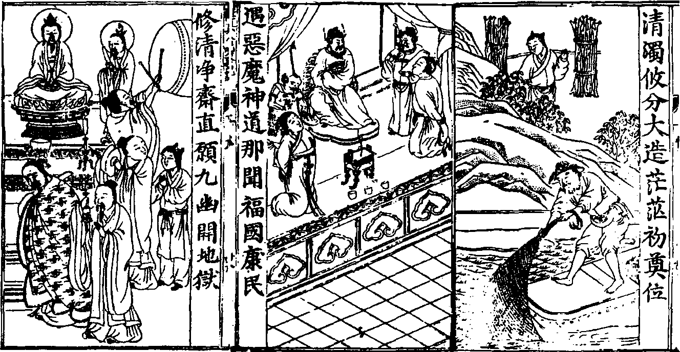 萨真人携王善游酆都,欲济拔幽魂滞魄。二人过了鬼门关,上殿与十殿阎君相见,崔判官引真人与王善游地府。在赏善行台见历代忠臣孝子,在罚恶行台中见到十重地狱,阴风森森,世上十恶不赦之徒在此经受各种酷刑。枉死城中,昔日为真人弄刀笔而死者、误投药饵医死者纷纷前来索命。枉死城主郑德翁乃旷野毙死的裸体老者,见真人即忙低头下拜,两泪长流,感真人之恩,将这些冤鬼打发。一群童男童女之鬼扯住王善,又打又骂,要其偿命。恰关真君至酆都,遂将真人王善带出枉死城。真人与王善同回阳间,径归西河做一个拔冥济苦的道场。萨真人将自家田园屋宇卖掉,做一个十日十夜的大供,召地府一切孤魂怨魄,每日三餐施食。又化了许多冥钱周济诸鬼,功德圆满,众鬼魂欢天喜地而散