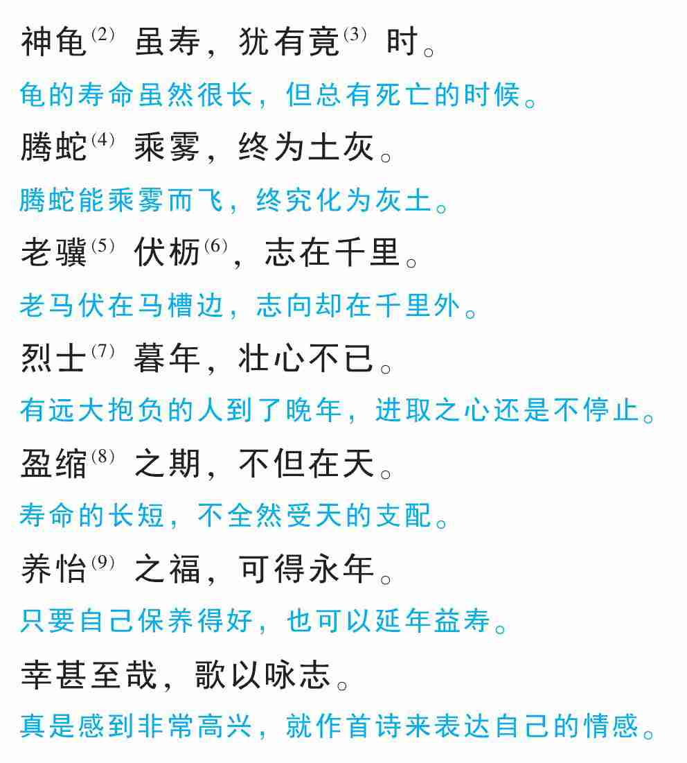(1)选自 《乐府诗集》。 《龟虽寿》 是曹操的乐府诗 《步出夏门行 》 四章中的最后一章 。 (2)〔神龟 〕 龟的寿命很长, 古人将它作为长寿动物的代表。 (3)〔竟〕 终结, 这里指死亡。 (4)〔腾 (téng) 蛇〕 传说中龙的一种, 能乘云雾升天。 (5)〔骥〕 一日能行千里的良马。 (6)〔枥〕 马槽。 (7)〔烈士〕 指怀有雄心壮志的正直人士。 (8)〔盈缩〕 盈, 长; 缩, 短。 (9)〔养怡〕 保养身心健康。