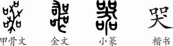 “哭”是会意字。甲骨文字形会众人喧哭于桑枝之下。古代丧事用桑枝作标志,现在办丧事时用的纸幡,就是用桑枝作标志。隶变后楷书写作“哭”。