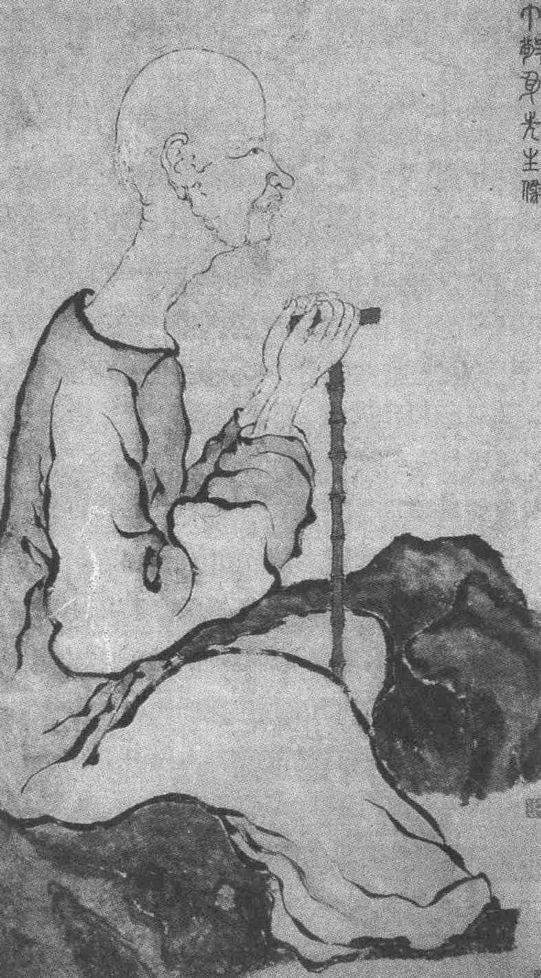 罗聘使出了画人物的浑身解数,又启动了他的智慧。他根据丁敬额、眉、目、唇、颏的特征,设计了一个全侧面的坐像。这对于非肖像画行家来说,无疑是最佳的选择,它不仅减弱了正面写真的难度,而且还有效地突出了像主的特征。丁敬发稀额高,额和眉目之间的过渡又不甚明显,侧面画来,轮廓线就能清晰地反映额和眉目之间的关系;丁敬的鼻和人中较为接近,侧面表现,毫不费力;丁敬的下巴短颈项长,侧面描写,历历分明,也很美观,还有丁敬的耳朵大而平扁,侧看恰是耳朵的正面,可作直观的描绘。对于不谙人像向背明暗之道的罗聘来说,他手中单一的线描方法,唯一可取的就是勾画轮廓。罗聘用铁线描去勾画丁敬的脸庞,比起他擅长的圈梅线条,同是圆形,却有程度上的差异,同是细线,却有形似上的不同要求。因此,这样的线描尽管很出色,但那种谨小慎微,在形象的真实上费尽踌躇,在行止之间的犹犹豫豫,都在线条的断续中反映出来,然而也看得出罗聘在勾画形象上徘徊之后的果敢,他画丁敬的鼻子线条流畅、肯定,一气呵成。罗聘画丁敬的脸部时的心态,像是参加一次必须参加而又无十分把握的考试那样,小心应对。虽然双手画得不尽如人意,毕竟有手杖的掩护,脸和手画完,便如释重负了。衣褶以兰叶描的线条,凝重又不无飘逸,这是整个画面最具光彩处,是罗聘释重后的轻快笔触。丁敬坐的石块,用了浓墨淡渗的破墨法,也有照人的光彩。