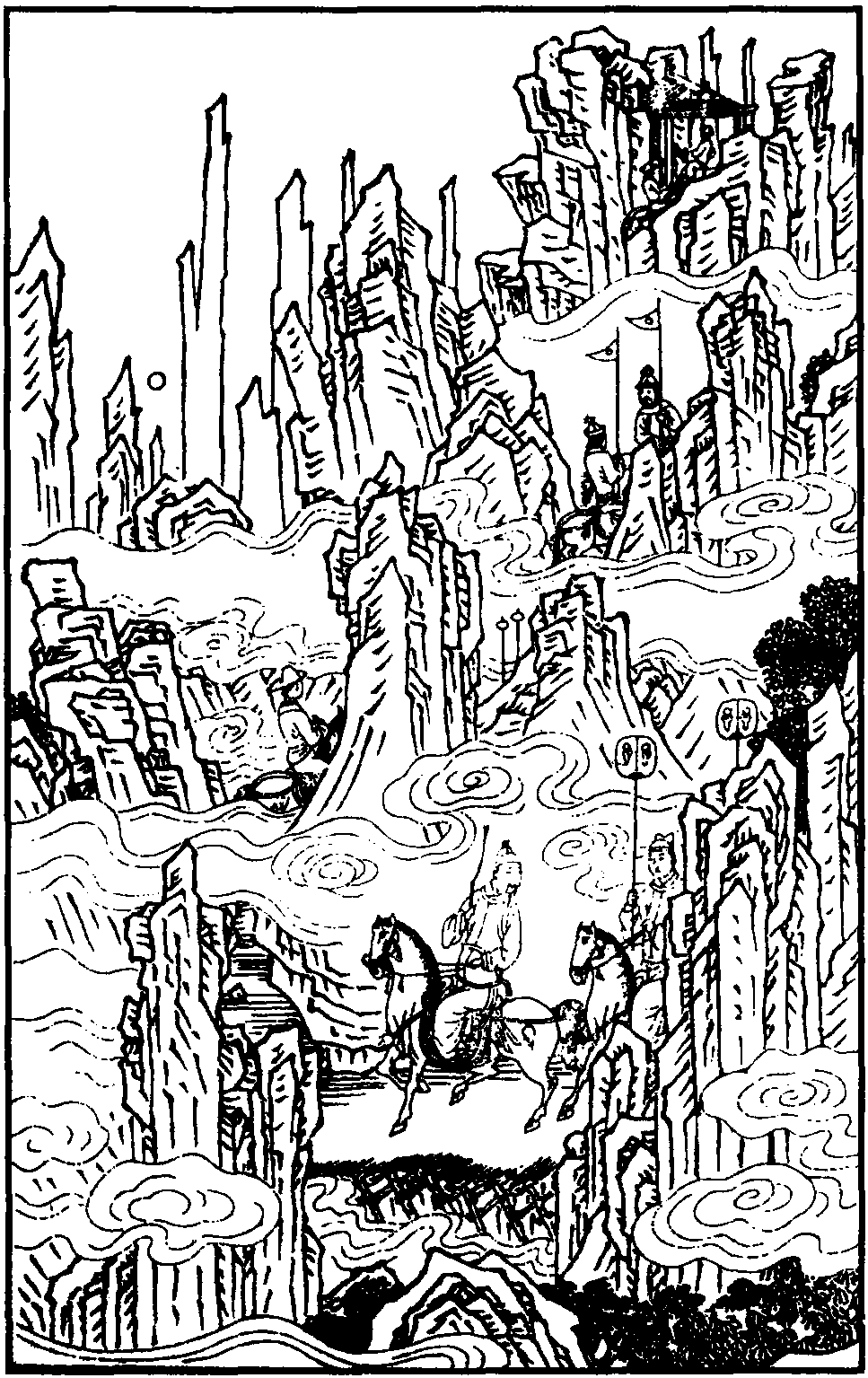 【鸳鸯煞】黄埃散漫悲风飒,碧云黯淡斜阳下。一程程水绿山青,一步步剑岭巴峡。唱道感叹情多,恓惶泪洒,早得升遐,休休却是今生罢。这个不得已的官家,哭上逍遥玉骢马。
