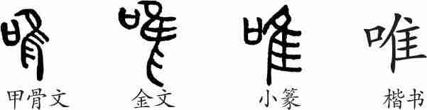 “唯”为会意兼形声字。甲骨文从口,从鸟,会鸟鸣声之意。金文大致相同。小篆的形体承接甲骨文、金文,并整齐化。隶变后楷书写作“唯”。