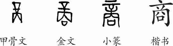“商”是会意字。甲骨文的下部是祭祀时所设的灵台,其上置薪,焚烧祭天。金文下面增加了一个“口”。隶变后楷书写作“商”。