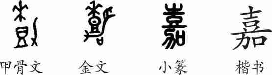 “嘉”是会意兼形声字。甲骨文左从壴,右从力,会尽情娱乐之意。金文下边加“口”,以突出欢笑之意。小篆整齐化,从壴,加声。隶变后楷书写作“嘉”。